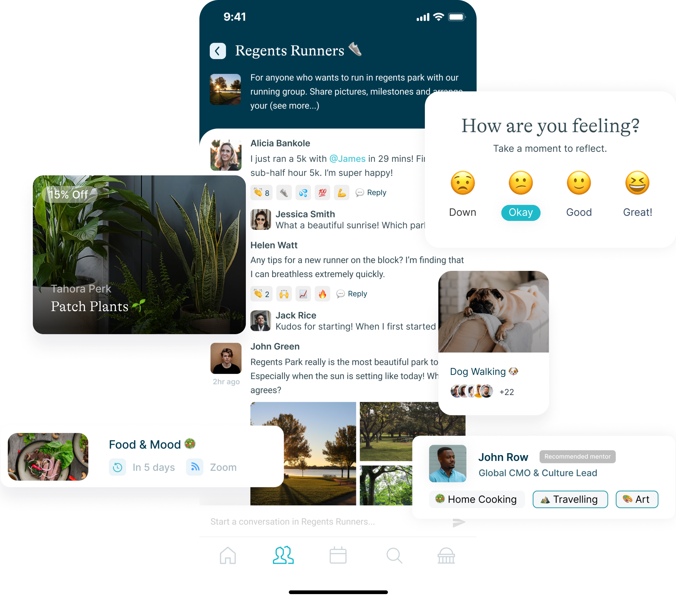 Happy employees lead the conversation, participate and stay healthy. Forge long-lasting bonds around shared interests for friendship, mentorship and support.